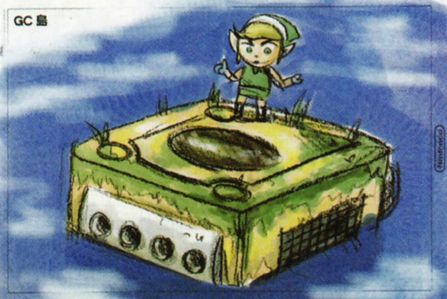 Hyrule Historia reveals that a GameCube-shaped island was designed for The Wind Waker, but never made it to the final game. This concept art belongs to that unused island, though there is an island shaped like a Nintendo DS in Phantom Hourglass.